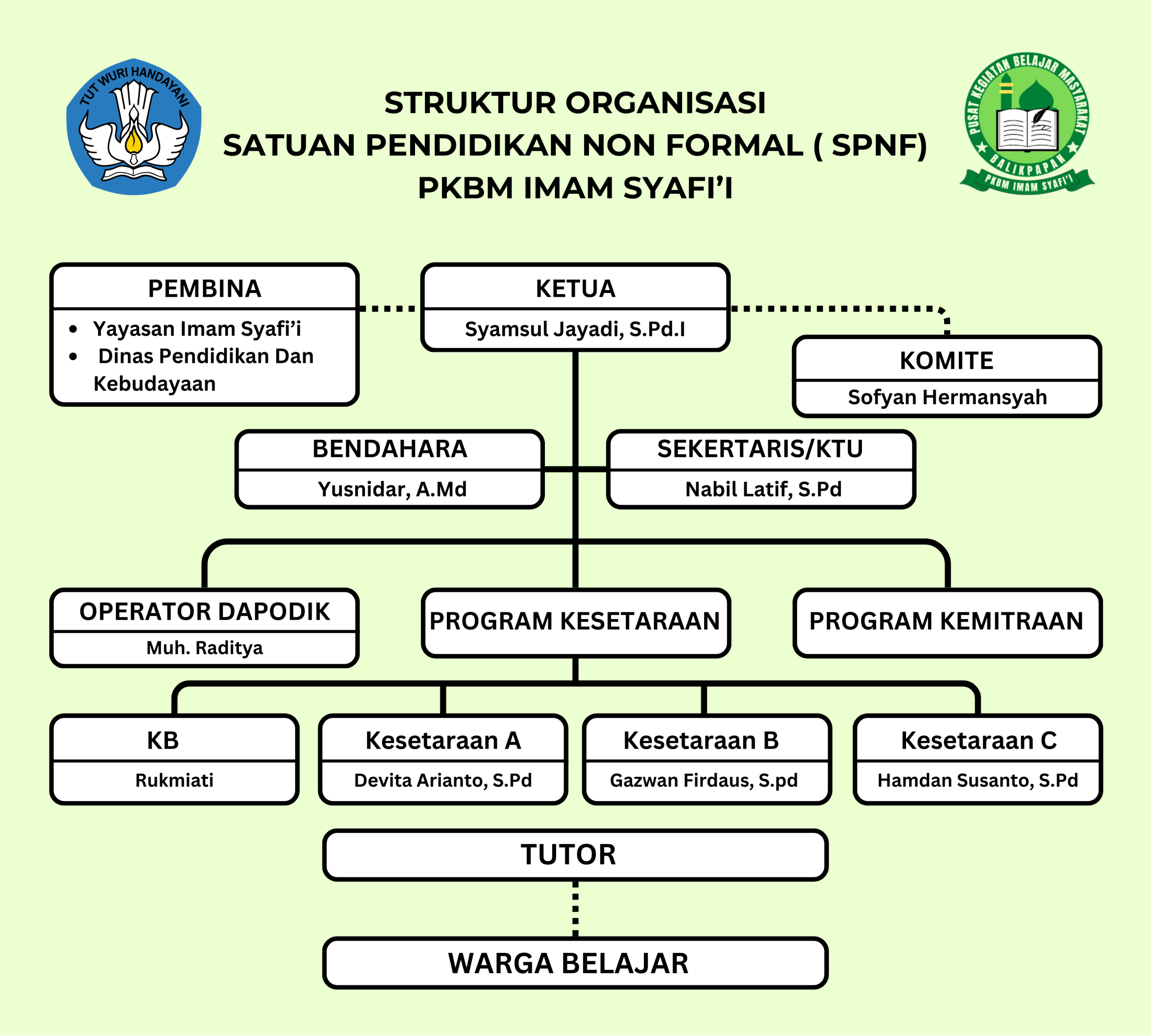 PKBM Imam Syafii Balikpapan adalah salah satu Lembaga yang berada di bawah Yayasan Imam Syafii Balikpapan yang berdiri pada tahun 2022 dengan legalitas sebagai berikut: